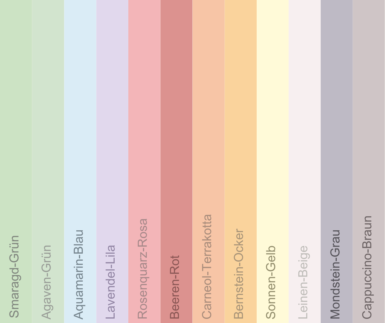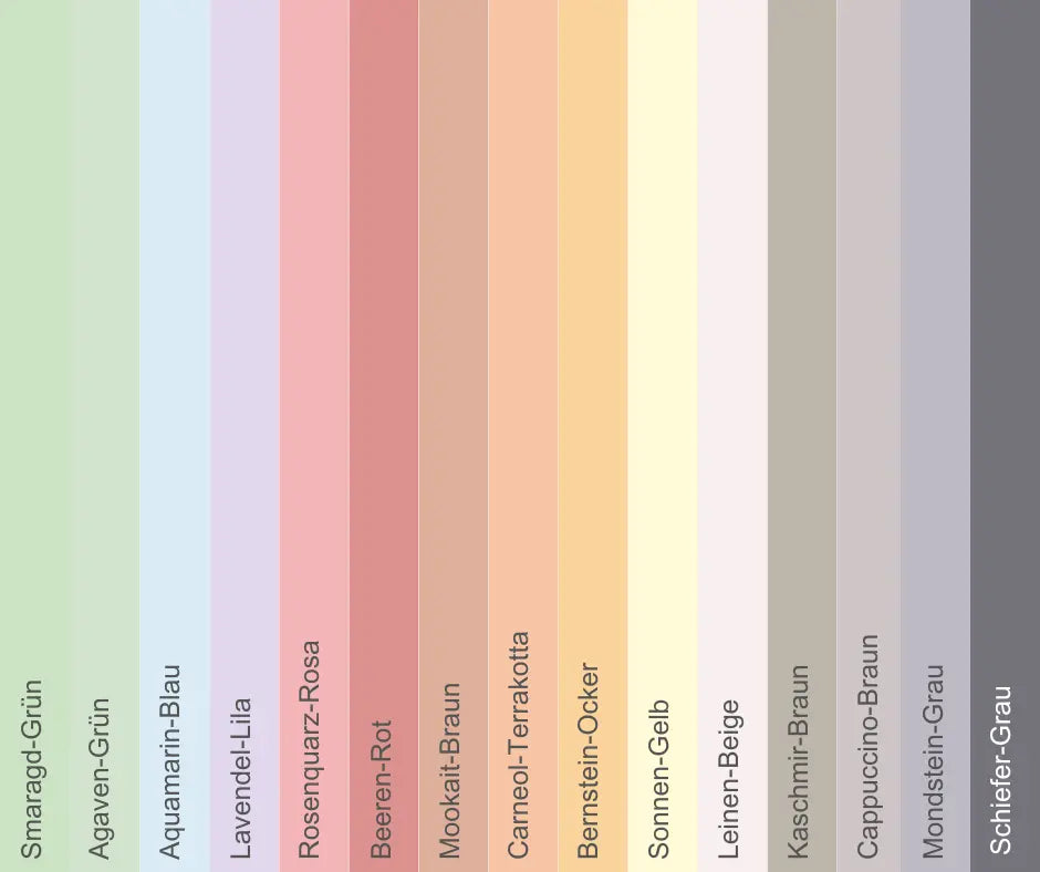 Alle natürlichen und lichtechten Farbtöne auf einer praktischen, klappbaren Broschüre inkl. Farbbeschreibungen. Einfach bestellen und Wunschfarbe bequem in Ihrem Zuhause testen.