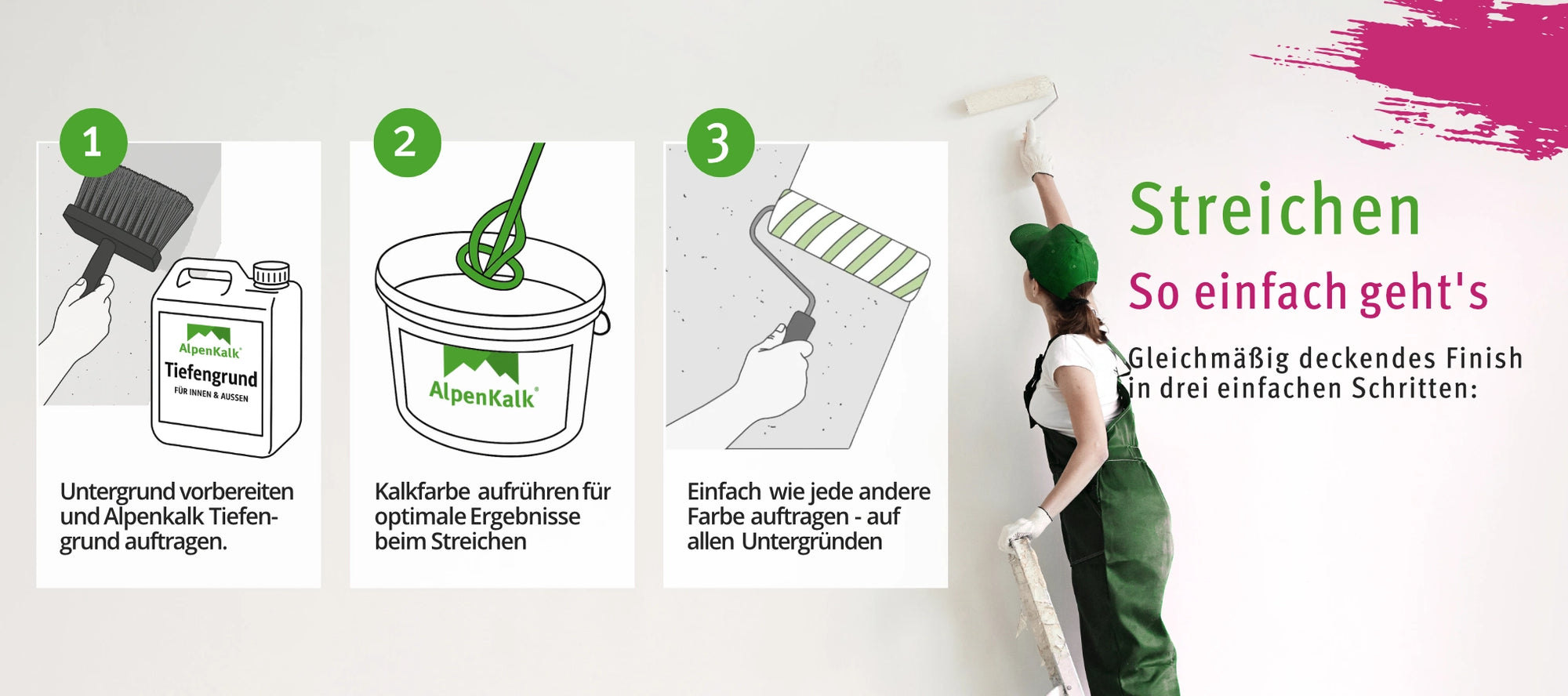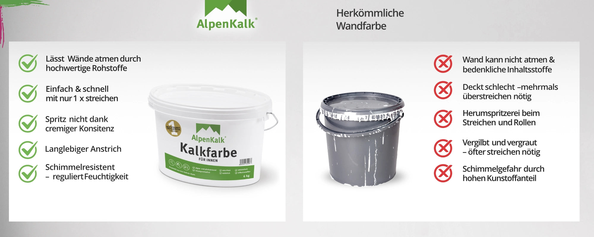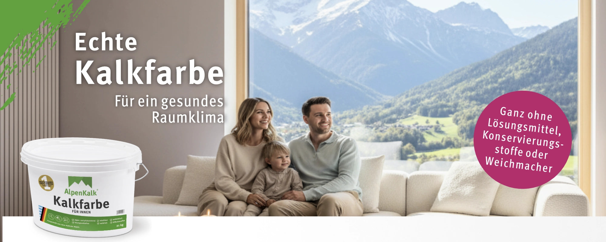 Die Vorteile nutzen und die gewonnene Zeit genießen. AlpenKalk Kalkfarbe kaufen von AlpenKalk … dann haben Sie viele Jahre lang jeden Tag aufs Neue „frische Freude“. Kalk ist nicht nur einer der älteste Baustoffe der Welt, sondern auch einer der modernsten. Denn mit seinen vielen natürlichen Eigenschaften kommt er dem Bedürfnis des Menschen nach einem angenehmen Wohlfühlklima entgegen. AlpenKalk fügt durch ein besonderes Veredelungsverfahren seinen natürlichen Vorteilen noch weitere hinzu.