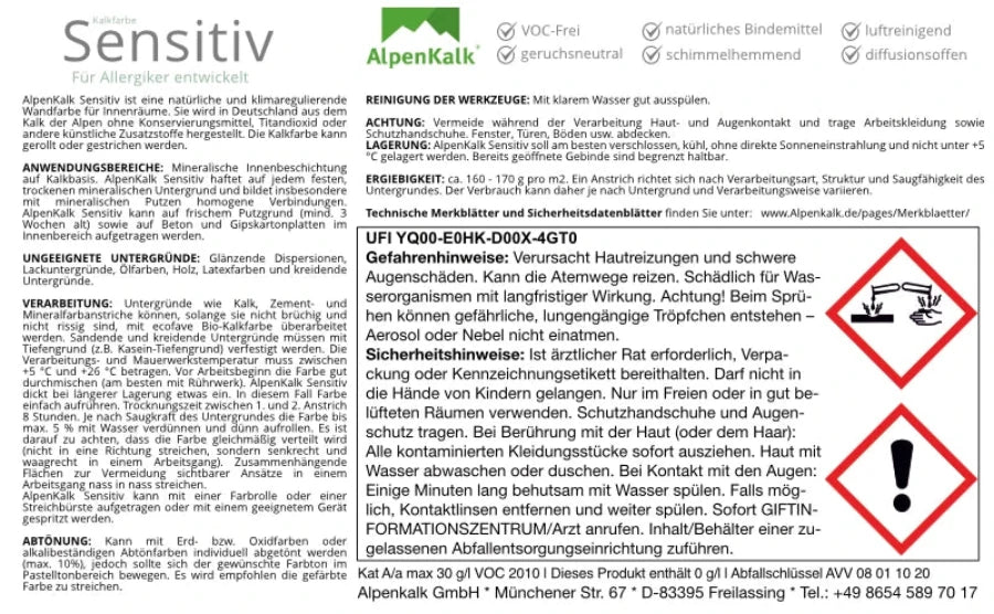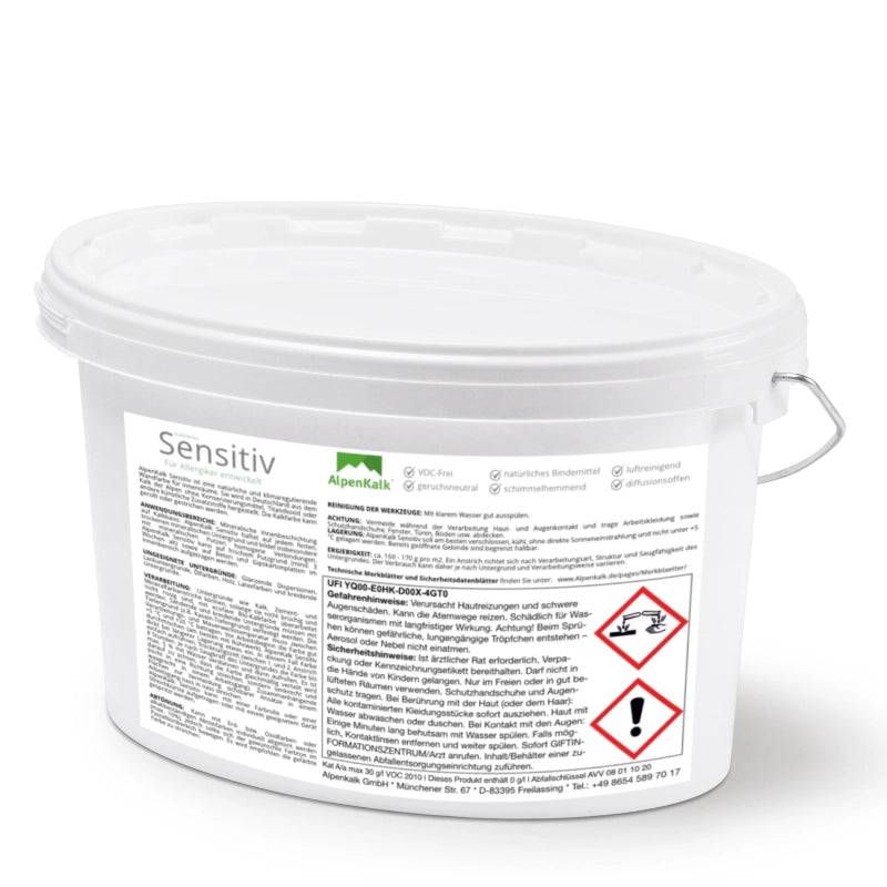 Kalkfarbe Sensitiv von AlpenKalk für gesundes Wohnen. Dieser Kalkfarbe Sensitiv aus Kalk ist ohne Konservierungsstoffe, frei von synthetische Bindemittel, lösungsmittel- und weichmacherfrei. Frei von lästigen Gerüchen usw.